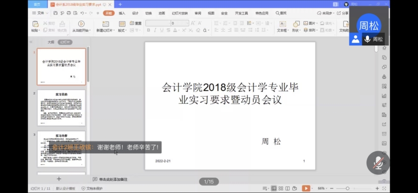 2022年2月21日,beat365亚洲体育官方网站周松在腾讯会议上给2018级会计学专业员工开展了毕业实习动员会议。动员会议上,周松从实习内容、实习时长、时间节点、考核方式、指导老师、安全措施、安全预案等七个方面讲解了这次毕业实习的具体要求。会议要求全体同学一定按照公司相关规定完成本次毕业实习。