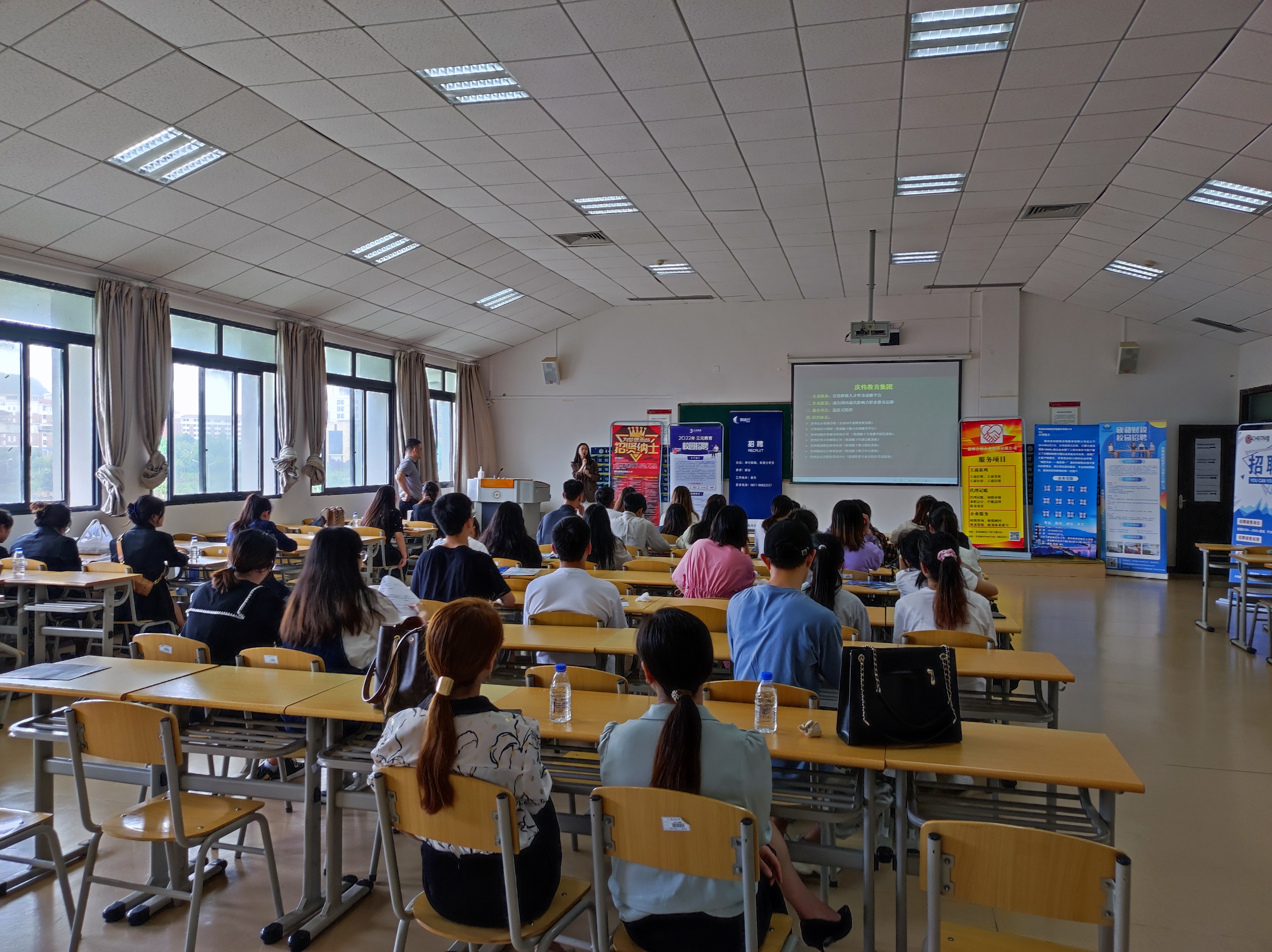 在招聘会中,贵州庆伟教育集团、贵州三鼎墨元教育咨询有限公司、贵州明诚舟会计师事务所、贵州合创企业管理咨询有限公司、贵州欣和财税有限公司五家单位来公司进行人才招聘,大概有80余位同学参加了本次招聘会。
