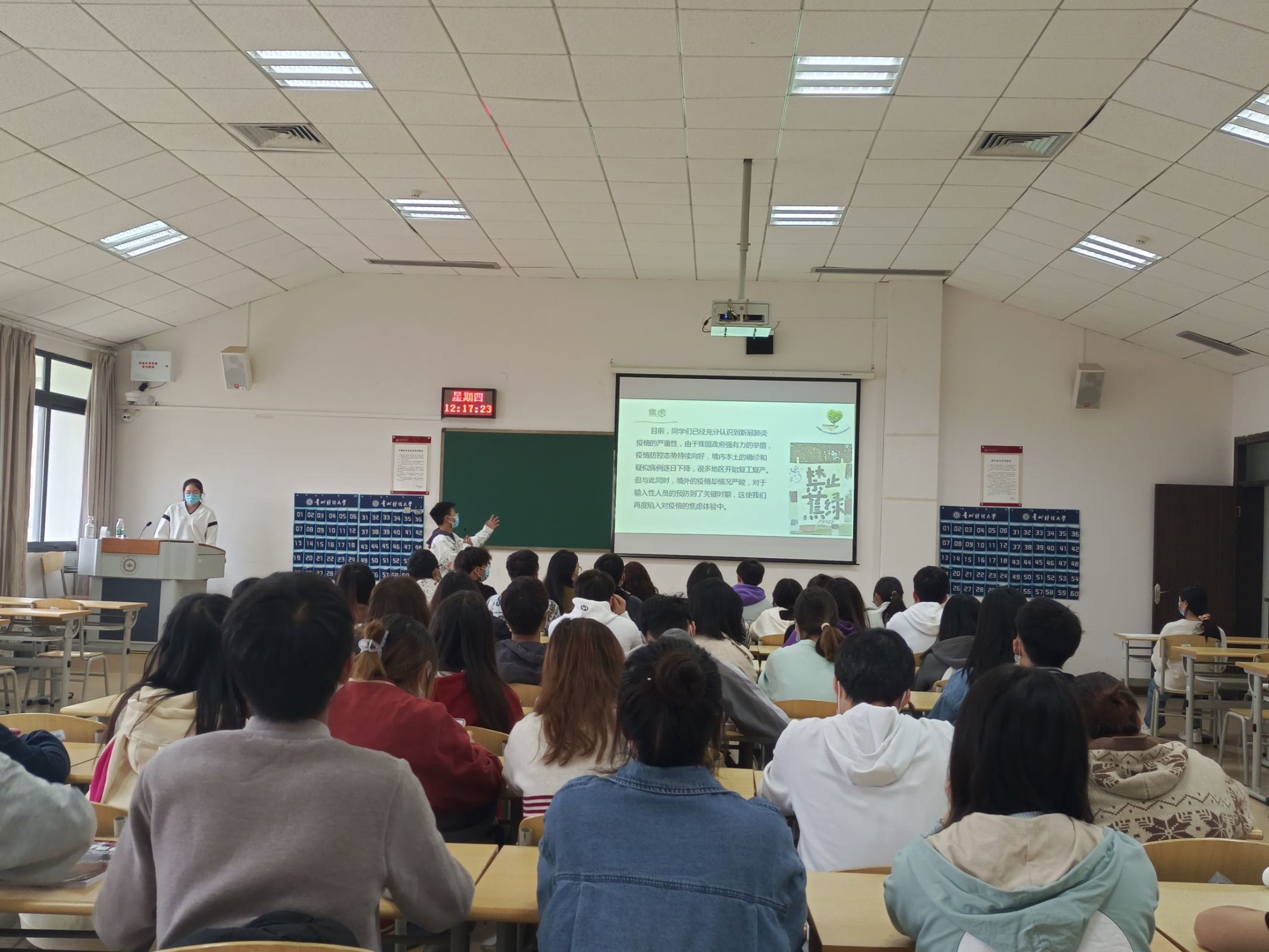 主题班会从疫情下老员工的精神内耗、疫情下老员工产生心理困扰的原因、疫情后老员工的心理疏导、疫情后老员工的使命与担当四个部分展开。心理委员王述超同学首先介绍疫情防控下同学们可能会产生的几种负面情绪,并分享如何处理负面情绪的应对和疏导方法,帮助同学们增强心理韧劲,提高心理免疫力;其次大家逐一分享在校园封闭管理期间自己的学习和人生规划,引导同学们以更加平和乐观的心态面对疫情防控工作;随后,黄忠莉副书记对主题班会进行总结,她称赞心理委员们在疫情下员工管理工作中发挥的重要作用,鼓励大家继续带好头,各班要通过形式多样的学习向同学们普及心理健康相关知识,开展有效的心理疏导工作,对发现的异常状况要及时伸出援手、及时上报,共同建立稳定的身心环境。