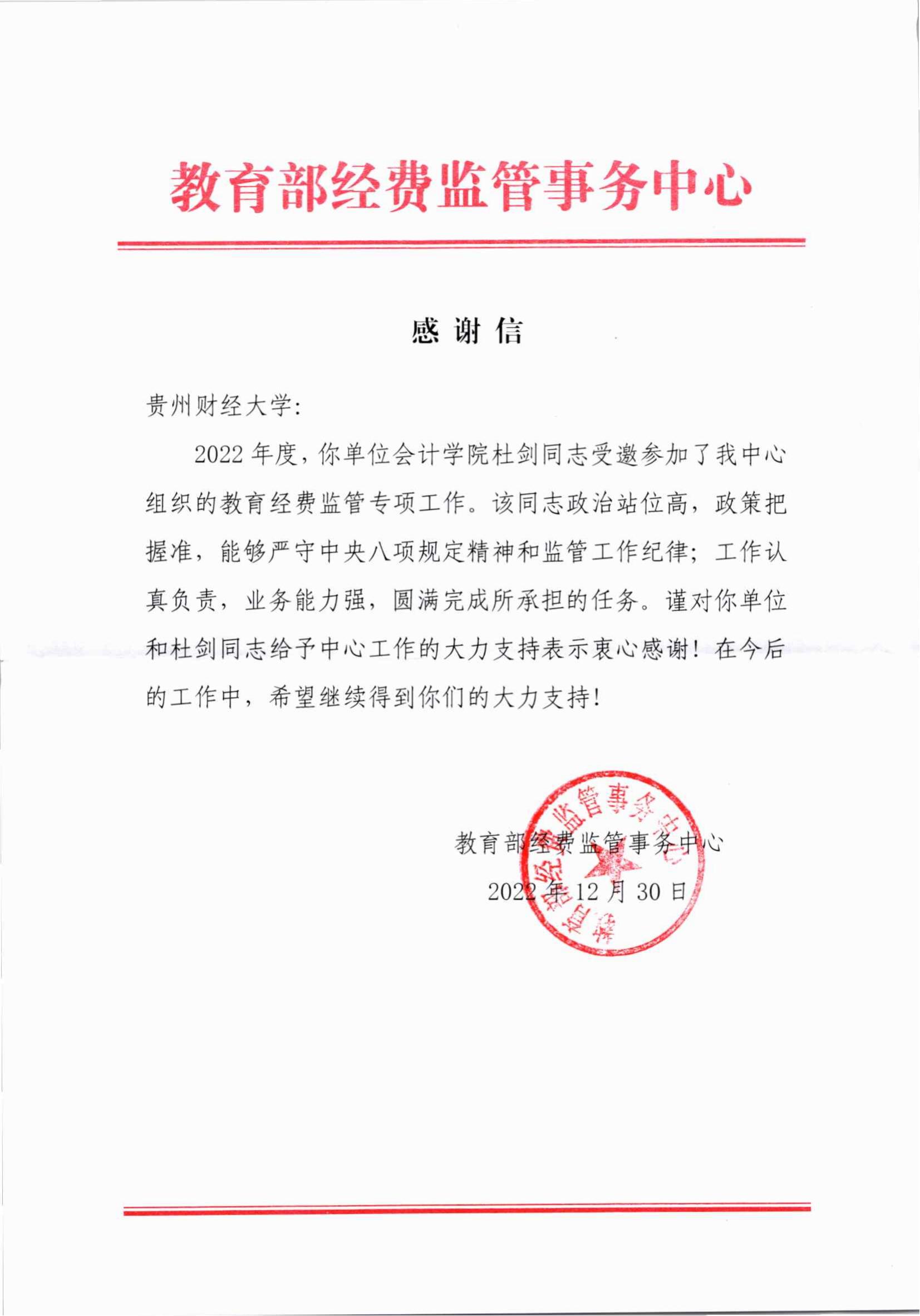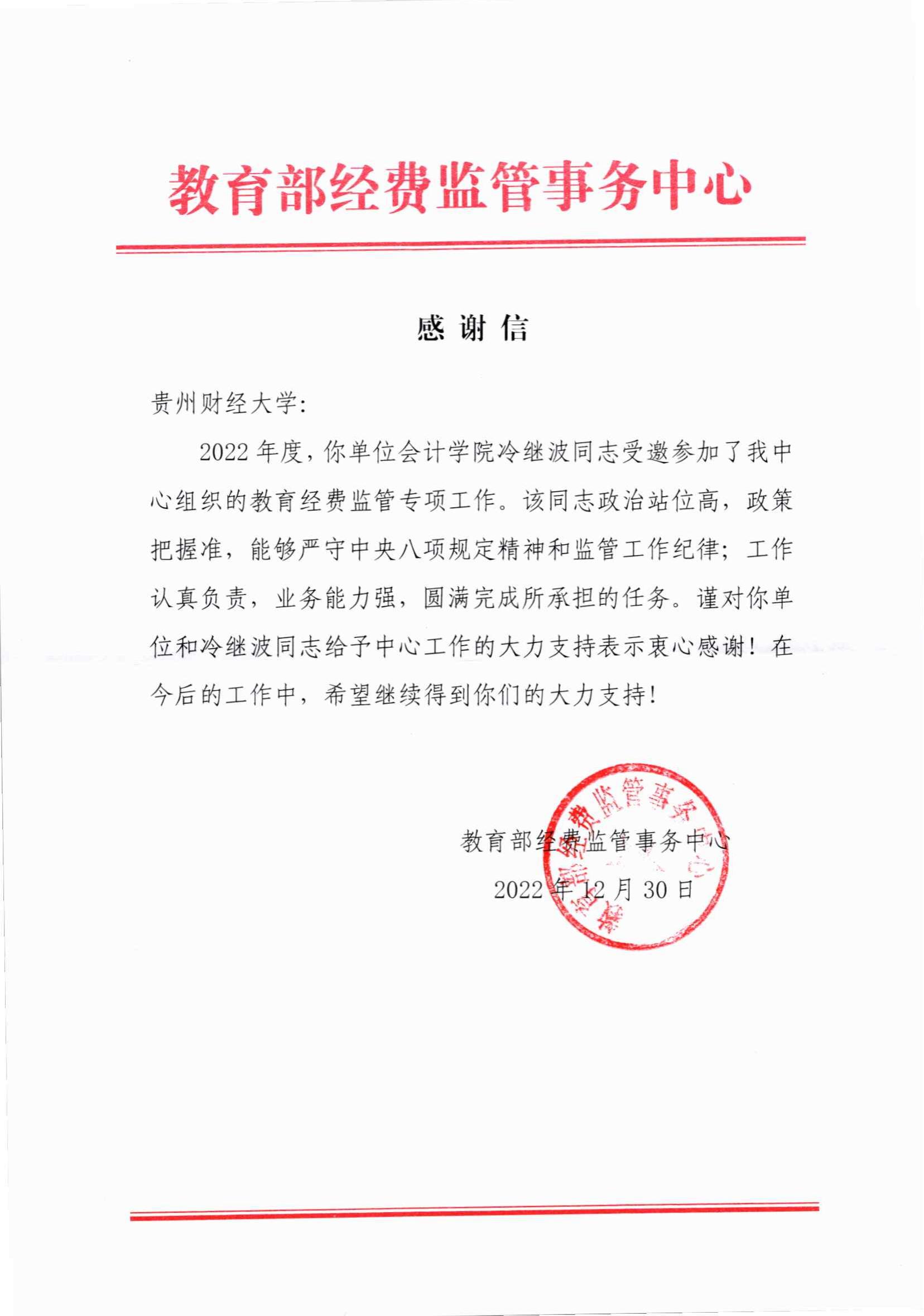 近日,教育部经费监管事务中心向公司beat365亚洲体育官方网站发来感谢信,对公司beat365亚洲体育官方网站党委书记聂永刚、经理杜剑、教授冷继波2022年参加教育经费监管专项工作表达了衷心感谢,并对三位教授的政治站位、业务能力进行了表扬。