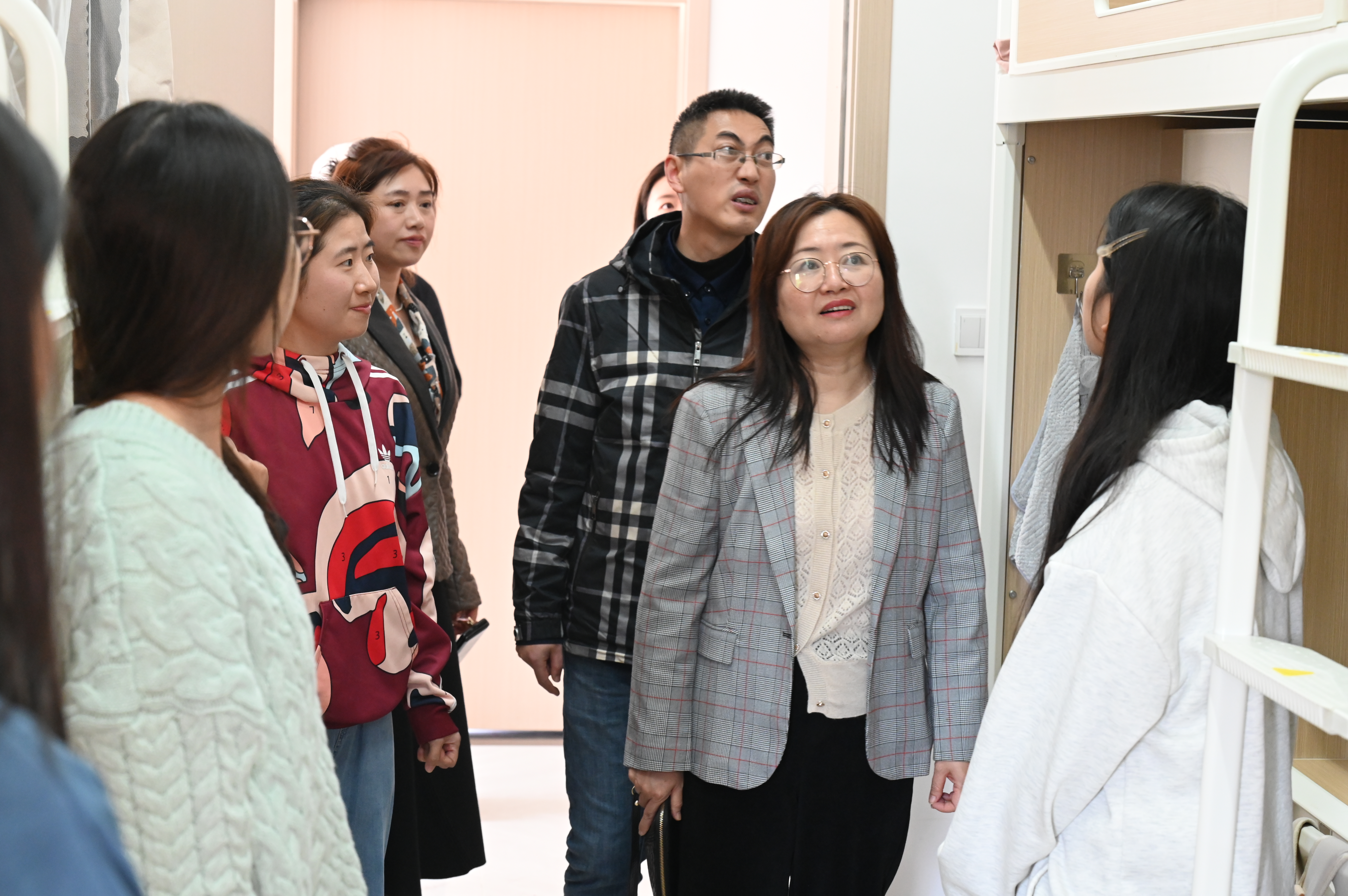 最后,肖小虹深入到东校区文心苑寝室进行走访,充分了解员工的思想动态和学习生活情况。“同学们来自哪里?”“上下楼梯滑不滑?”“热水水温够不够?”“对公司各方面有什么建议?”……肖小虹的关切慰问让同学们倍感温暖,深刻感受到了公司对员工们的关心和关怀。