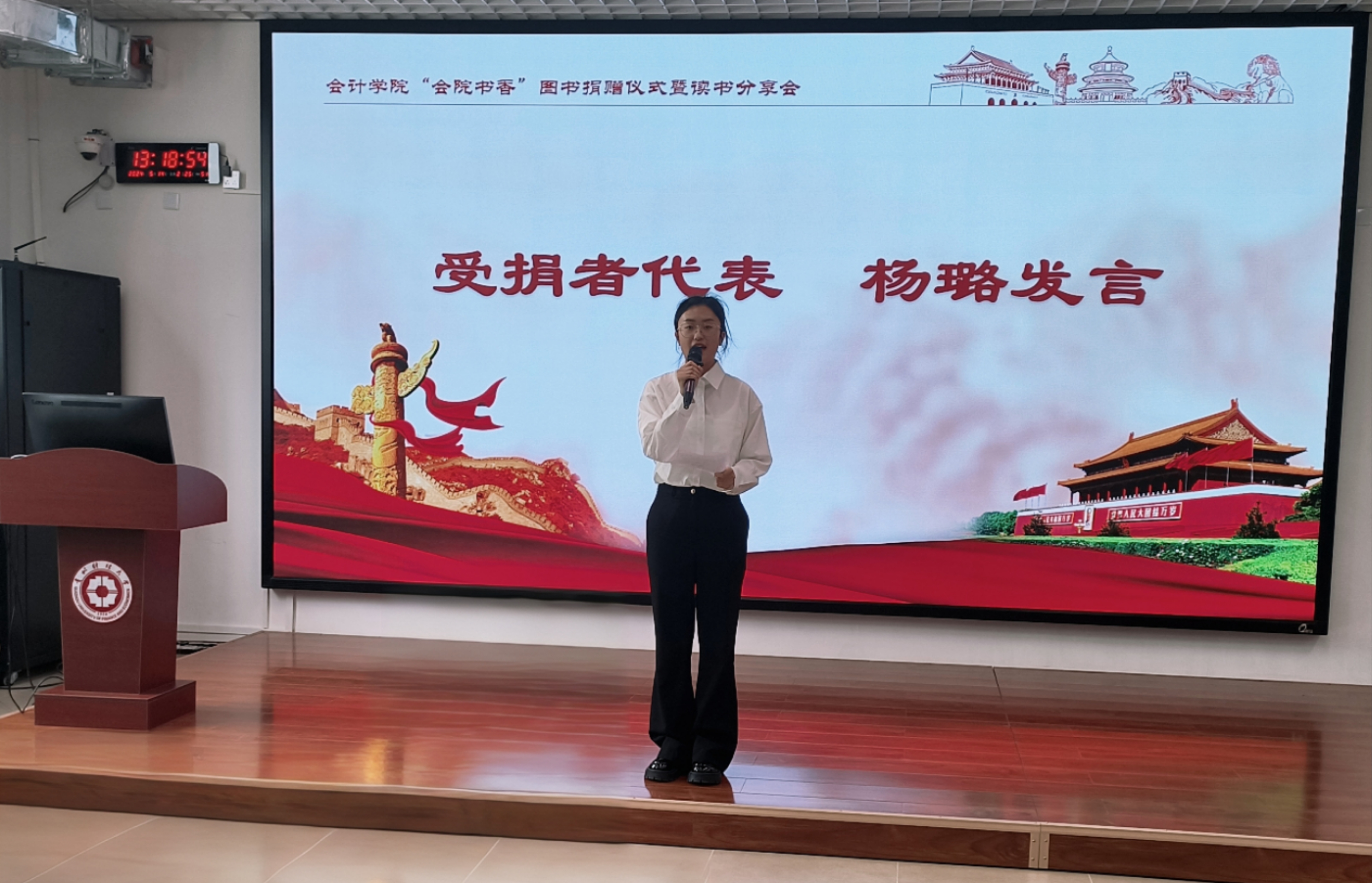 捐赠者代表杨雪峰和受捐者代表杨璐分别上台发言,表示将发扬会院传统,传递书香氛围,将常读书的好习惯坚持下去,从书中不断汲取精神食粮,用理论指导实践,不断强化个人修养。