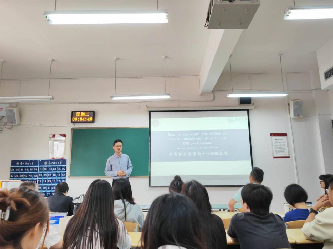 复旦大学朱振梅分享了题为《Does big data affect managerial bad news hoarding? Evidence from third-party online sales disclosures》的学术报告。北京师范大学经济与工商管理公司博士生导师杨丹分享了题为《企业ESG表现与高质量发展:基于香港交易所ESG政策变化的准实验研究》的学术报告。中国人民大学商公司博士生导师张博分享了题为《CEO Succession Origin and Investment Efficiency: Evidence from China》的学术报告。江西财经大学教授张洪辉分享了题为《非关联股东、一致行动人与公司绩效》的学术报告。