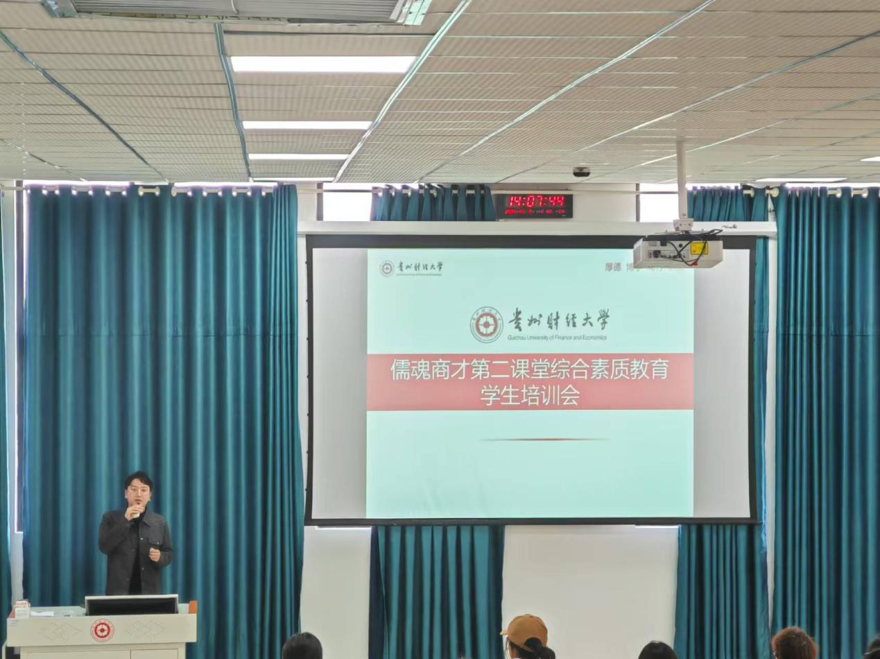 教务科覃茳坤老师从积分获取方法、评分认定标准、申请原则等方面对儒魂商才“第二课堂”综合素质教育进行了培训。