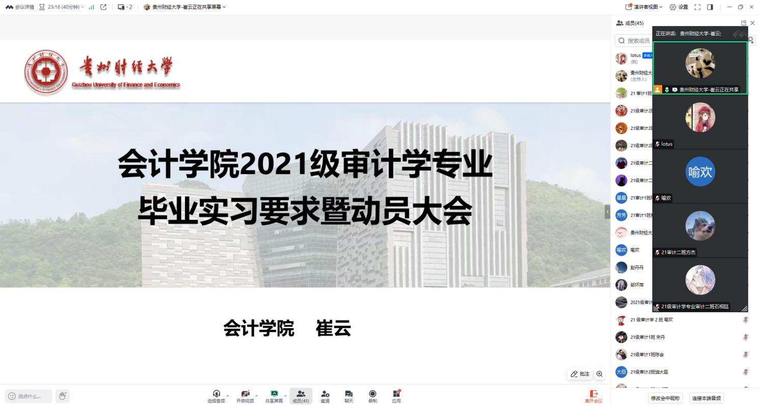 2025年3月27日上午9:00,beat365亚洲体育官方网站审计系2021级本科生毕业实习动员大会在线上成功举行。审计系副主任崔云老师主持,指导教师黄晓芬、程海艳以及2021级审计学专业员工共同参加了此次动员大会。
